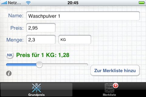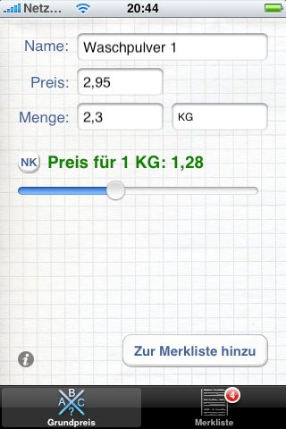 iGrundpreis ermittelt den Grundpreis (Preis durch Menge) von Produkten. Im Zuge neuer EU-Gesetzgebungen ist einfacher Preisvergleich im deutschen Einzelhandel schwieriger geworden. Durch für die Hersteller jetzt freigegebene Verpackungsgrößen (nun sind auch krumme Inhaltsmengen zulässig) und oft schwer entzifferbaren oder gar völlig fehlenden Grundpreisangaben wird versucht dem Verbraucher weniger für's gleiche Geld zu verkaufen.